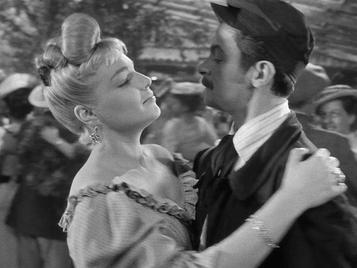 Pero si bien todos estos elementos hacen fluir una trama perfecta y precisa, en realidad, pienso, no es eso lo que más me atrae de esta película, sino su costado más Renoir, si se quiere. Todo empieza con un río y un día de verano: un grupo alegre de jóvenes está volviendo de remar un rato. Llegan a una posada con mesas al aire libre y ahí nos enteramos (con esos detalles que llenan la película) a través de un diálogo al pasar de que las mujeres bullangueras y felices son putas, y la banda que las pasea es una banda de criminales y cafishos que también salió a pasar, como los señores burgueses, un día domingo al sol. Los une el calor y la hierba. Y la música también, que pronto empieza a sonar, una vez que los carpinteros terminan de arreglar la tarima. Ahí entra Reggiani, ex presidiario, hoy carpintero con un nombre nuevo. Se cruza con un antiguo compañero de celda (uno de los de la banda), este lo invita a tomar una cerveza con los amigos y ahí se cruza con ella, Marie, Casquito de Oro, Simone Signoret. Se cruzan miradas. Hay doble cruzada de miradas con el actual amante/administrador, pero ella lo invita a bailar y ambos escapan de los hilos de la tensión dando unos pasos al costado hacia la pista de baile.