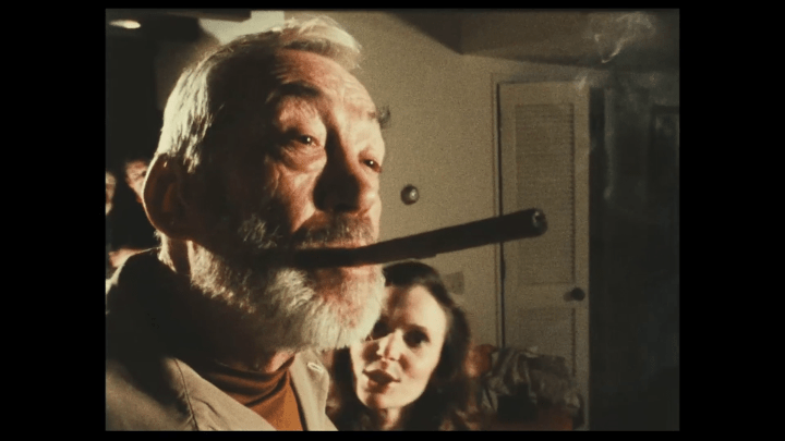 Por otro lado, otro aspecto que pone en evidencia Al otro lado del viento es la maestría absoluta que tenía Welles sobre el montaje. Quienes vieron las últimas películas (terminadas) de Welles lo saben: el gordo manejaba la edición como ninguno. Ahí está la escena de batalla de Campanadas a medianoche, y todo F de falso, en la que Oja Kodar logra calentar hasta al propio Picasso gracias al arte de Orson. No hablo solo del montaje incesante (y en distintos formatos) que compone el material de la fiesta (la parte “confesional”), sino también de la película adentro de la película, de nuevo Oja Kodar calentando a todo el mundo. Según algunos, esa ficción ficcional sería algo así como una parodia del cine autoral que se hacía por ese entonces (Antonioni suena por ahí), pero es evidente que es más que eso por el simple hecho de que esa película incluye una de las mejores escenas de sexo jamás filmadas. Una escena que, según dicen, fue una de las pocas que montó el propio Welles. No es solo Kodar la que calienta las cosas en ese auto, son las manos de Welles que la tocan en un trabajo de montaje meticuloso.