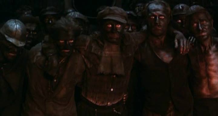 En La perla de la corona, sobre una huelga de mineros contra el cierre arbitrario de su fuente de trabajo a principios de siglo, pueden verse recursos igualmente fabulosos: planos frontales y folclóricos sin profundidad de campo ni espacial, sobreencuadres geométricos, terrenos en contrapicado que achatan a las multitudes y buscan trascender el límite físico del suelo para filmar a quienes resisten debajo, y un uso expresionista del color que transforma a los mineros en criaturas infernales. Pocas películas narrativamente robustas han sido capaces de estos niveles de abstracción. Cuenta la historia de una huelga minera que en 1934 se plantea como una lucha por la independencia económica de Polonia, ya separada de Prusia pero sometida a sus capitalistas. Lo fabuloso es que la película es entre otras cosas una tela donde el blanco, el negro y el rojo le disputan la primacía al argumento. El grupo de obreros recién salidos de la mina son una mancha negra que va al encuentro de la mancha blanca compuesta por sus mujeres. La esposa del protagonista es pura claridad, vestuario blanco flameante como el del cuadro con motivo virginal femenino que preside la cama y pelo rubio, a menudo realzada por los marcos de las ventanas pintados de rojo, retratos de la diosa como los que por entonces y entre nosotros filmaban Favio en Nazareno Cruz y el lobo y su hermano en El fantástico mundo de la María Montiel. Desde su opera prima de 1960, Kutz cambiaba continuamente de escala visual: a cenitales de la tierra resquebrajada le siguen espléndidos primeros planos que tanto pueden ser frontales como pasolinianos alla Mascagni. El expresionismo de la banda sonora transforma a la fábrica en un monstruo majestuoso: cada vez que sube y baja el montacargas resopla un dragón, pero enmudece la única vez que va cargado con los cuerpos de los huelguistas desmayados. La luz roja de la mina contrasta con la negrura progresiva de los cuerpos de los obreros zombificados por el maquillaje. El contrapunto entre los interiores subterráneos y la superficie solar son también los que Kutz dispone entre la lucha obrera y la resistencia activa de sus familias, entre el polvo asfixiante y el agua purificadora. Los colores son materias que literalizan símbolos, como en la escena del trabajador reprimido con mierda, y se abren a la contradicción con el comunismo: el rojo de la protesta minera se extiende a la iglesia, en la que la policía al servicio del capitalismo extranjero también entra a reprimir. El templo católico es tan sagrado como la fábrica que los obreros defienden del capital descentralizado dispuesto a inundar la mina aún productiva para irse a donde más le convenga, despreocupándose de la comunidad ya explotada. Uno de los grandes aciertos es el sentido del humor: la picardía campesina nunca permite que las víctimas den lástima. Hasta la composición es juguetona, confirmando que las simetrías de Wes Anderson también nacieron en Europa del Este (hay quienes señalaron con precisión la similitud entre sus planos y los de Jiri Menzel) y serían infinitamente más graciosas (quiero decir que estarían dotadas de gracia) si la rigidez de Kubrick no pesara tanto sobre los cineastas estadounidenses. La Guerra fría de Pawlikowski recogió el legado de la canción como resistencia antifascista que nació cinematográficamente con Canciones prohibidas, la película que puso nuevamente en marcha al cine polaco en la inmediata posguerra, y que acá se manifiesta en al menos dos escenas: un viejo parece ir de casa en casa trocando sus canciones de protesta por un plato de sopa y transmitiéndole oralmente sus tradiciones a los nenes de la casa en la primera. En la segunda, los mineros se las ingenian para fabricar instrumentos con lo que tienen a mano y arman una orquesta bajo tierra. Después le cantan la canción protestona y grosera a los patrones en la cara.