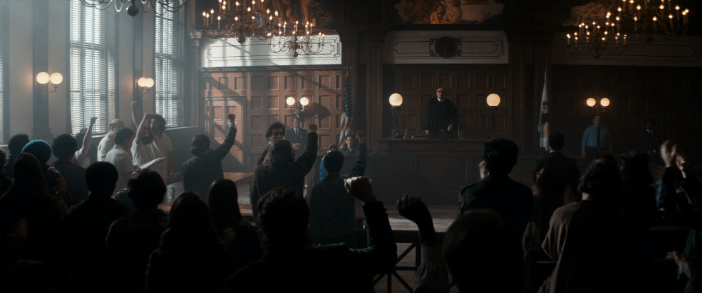 El primero de los artículos tiene alcances notables. La disputa política por el futuro es también una disputa por el origen. Lo que sostiene, a fin de cuentas, es que la historia entera de Estados Unidos es la historia de una idea nunca realizada. Si hay algo claro es que Hollywood le sacó jugo al conflicto entre los fundamentos democráticos y su negación cotidiana, entre las promesas y sus incumplimientos. Es casi un estribillo. En The Trial of Chicago 7, en el búnker de los acusados, cuando suena el himno en la televisión y la bandera ondea, todos se levantan y escuchan respetuosamente. En el estrado, Abbie Hoffman cita a Jesús y a Lincoln. Hollywood es una patrística. Cuando en The Post se hace público que Nixon le hace juicio al New York Times por publicar información clasificada, un periodista comenta: “Jefferson acaba de retorcerse en su tumba”, y al final, cuando la Corte falla a favor del periodismo, alguien reproduce las palabras de uno de los jueces, que invoca a los Padres Fundadores y concluye: “La prensa debería servir a los gobernados, no a los que gobiernan”. Lo que en The Post es obligación de hablar (hay que informar al pueblo sobre los actos de gobierno), en Puente de espías es obligación de callar (hay que mantener en secreto lo que el reo le dice a su abogado). El motivo es el mismo: la Constitución. Lo único que asegura la comunidad es la remisión a los fundamentos. Los fundamentos no se manchan. Todo lo demás, sí. La justicia es cualquier cosa menos ciega, los derechos no son independientes del color de piel, las corporaciones mandan. Nada funciona adecuadamente en América salvo el marco narrativo e ideológico por medio del cual el cine da cuenta de que nada funciona. Es fascinante y maníaco. La democracia es una idea contra la que comparecen realizaciones imperfectas. Un espíritu nunca respetado pero firme, siempre listo para la próxima derrota (en el excelente final de The Post, apenas se resuelve, con litros de emoción consitucional, el tema de los archivos sobre Vietnam, sale a la luz el Watergate). Esta matriz puede dar obras maestras, buenas películas o más comúnmente, películas mediocres como esta de Sorkin, que dejan bien en primer plano su funcionamiento y cuyo triste interés es servir como síntomas o ejemplos. The Trial of Chicago 7 es cine de ilustración ideológica. Pedagogía cívica.