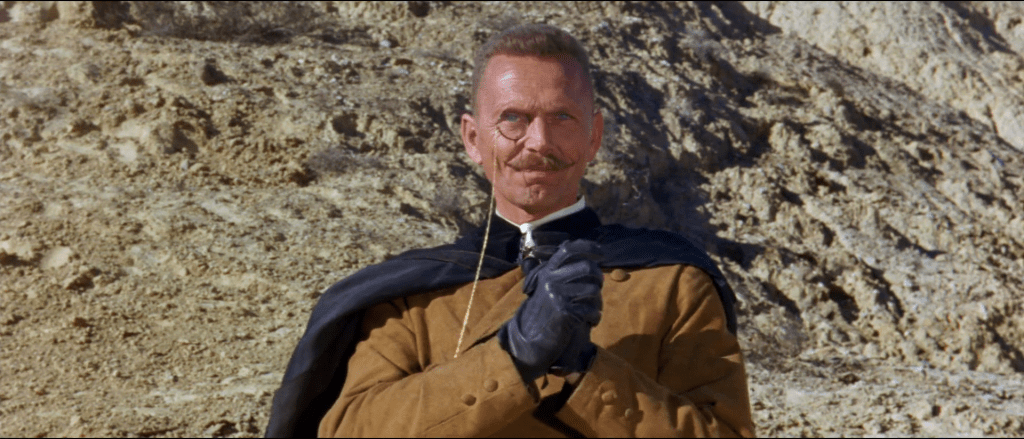 Lógicamente, ese lugar utópico tiene que ser algo distinto tanto del desierto en el que la película termina, entre la euforia y el vacío, como de las ciudades que el ferrocarril quiere unir, construidas en base a la explotación y gobernadas por la desigualdad. Cuchillo lo explica en un momento. El mundo se divide en dos: los que escapan y los que persiguen. Esta distinción -que obviamente equivale a otras: los poderosos y los débiles, los ricos y los pobres, los de arriba y los de abajo, como dice el Argentino en La ley de la frontera, de Aristarain- atraviesa y subordina al resto de las categorías; cuando el empresario yanqui le dice a su futuro socio mexicano que tal vez sienta algo porque Cuchillo es de su país, el mexicano contesta: “Es un peón”. Esta visión pícaro-clasista define perfectamente a la película, que hasta tiene a un austríaco en el grupo de los poderosos: un tipo de ropa caqui y monóculo, firme siempre como un milico, que toma champán marcialmente, toca Beethoven en el piano y según se cuenta participó de treinta y tres duelos y dejó treinta y tres viudas.