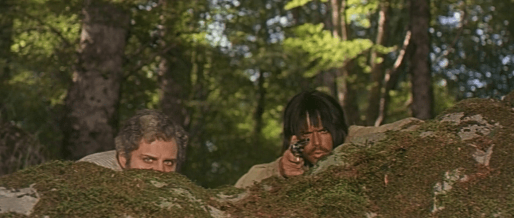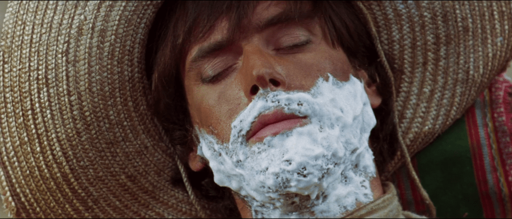 La banda-comunidad de Cara a cara es también paraíso perdido, isla y utopía. Materialización de los disfrutables -“Enjoy!”- “early times” del cartel que aparece en Ciudad violenta. Está habitada por “la gente más verdadera, libre y feliz”, le oímos decir a un personaje: “los restos de la vieja y romántica frontera que se niegan a aceptar la llegada del telégrafo, del tren, de la realidad en suma”. Así que también es un país hecho con ladrillos del por entonces medio abandonado Hollywood, pero sin el ánimo luctuoso de Wenders, viuda de todos, ni la nostalgia manufacturada en serie a lo Stranger things. Para que el corazón siempre romántico del cine no dejara de latir, los tanos se comieron el hígado de Hollywood, hicieron la digestión, fueron de cuerpo y se cansaron de encontrale forma a la mierda. Cara a cara es el piojo de Milian, un raccord de gargajos más políticamente elocuente que mucho programático intervalo modernista y el puto vínculo de los dos protagonistas. Si en El valor del miedo (Warlock, John Sturges, 1959) Henry Fonda cargaba en brazos a Anthony Quinn, como la corpse bride que era bajo la pilcha de macho pistola, Milian deja que Volonté le haga un pete tras la pantalla de la extracción de una bala en Cara a cara.