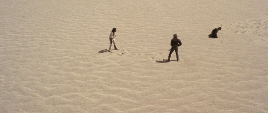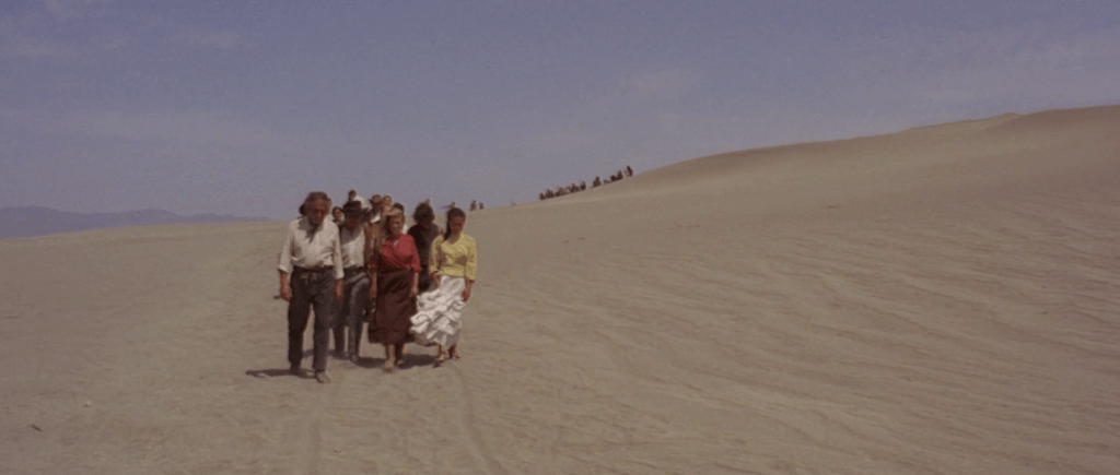 Además de las figuras de Fletcher y Beau, hay en Faccia a Faccia dos sociedades opuestas. La jerárquica, gobernada por los poderosos (terratenientes esclavistas, industriales, banqueros) y su aparato represivo, y la horizontal, una especie de comuna en la que los liderazgos no son formales y en la que todos pueden participar en igualdad de condiciones siempre y cuando acepten las reglas. Una ciudad y un falansterio. Este último -que al final gana un estatuto bíblico- es el corazón de la película. Tiene fuego suficiente como para aludir al mismo tiempo a los judíos en Egipto y al Tercer Mundo, y presentar además la diferencia política fundamental: en la película está claro quién es el Faraón, pero no quién es Moisés, cuyo rol es el que está en disputa (en cuanto a Dios, bien gracias). Fletcher es el Terror. Un jacobino de biblioteca que al conseguir poder se convierte en el fantoche criminal que vemos. Beau es el desprendimiento de un posible Moisés comunitario. El camino de Fletcher lleva al desastre que Leone cuenta en Giù la testa, y que el cine italiano indagó en múltiples formas. El camino de Beau no se sabe adónde conduce, por eso la película finaliza en el desierto, con todo terminado, con nada hecho.