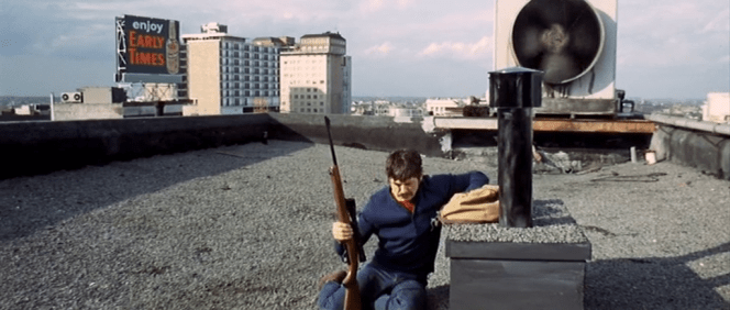 Bronson se llama Jeff, como Delon en El samurái, y pertenece al “mundo antiguo” de donde viene Armónica en Érase una vez en el Oeste. En palabras de Sollima, los “early times” que el cartel sobre una terraza nos propone disfrutar cuando todo termina, orden elemental donde la palabra se reduce al más mínimo sonido pero máxima expresión, y los símbolos se materializan en arquetipos. Araña y autos son signos plenos de significado y significante indisociables.