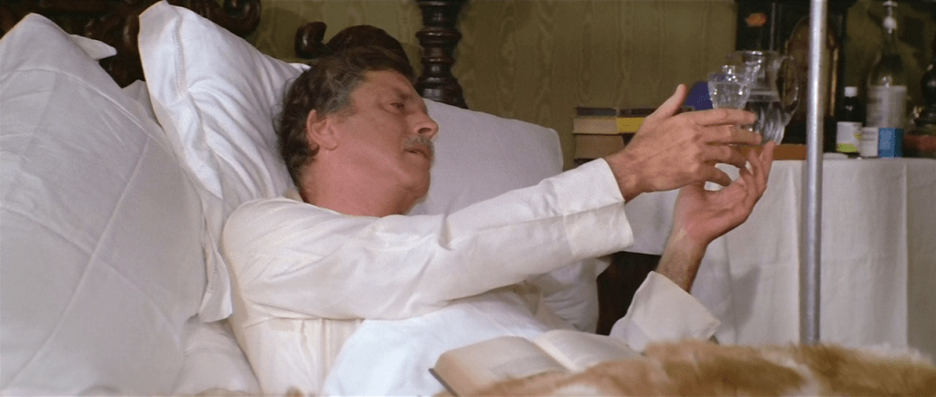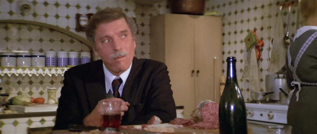 En Venecia, Bogarde llena a su personaje de amaneramientos que no tiene en los flashbacks que lo muestran como esposo y padre. Lancaster mantiene siempre su máscara cansada y viril. Por eso es más notable la manera en la que en ocasiones mira a Konrad. Cuando lo ve por primera vez, cuando descubre en una charla que es inteligente, cuando lo encuentra en la ducha, y sobre todo esa tarde en la que el profesor y sus inquilinos pican algo en la cocina. Los jóvenes están apurados, tienen hambre y el viejo guarda en su almacén un tesoro de pan, queso, salame y vino que comparte con gusto, como viviendo por unos minutos lo que sucede en sus cuadros. Visconti planifica la escena de manera clásica. Un espacio amplio presentado con planos generales, personajes bien distribuidos y un montaje claro, sostenido todo en el raccord de miradas. Los tres planos que me interesan -uno del profesor, uno de Konrad, uno del profesor- son extremadamente simples y podrían calificarse de rutinarios si no fuera por dos cosas: porque Visconti hace que los diálogos calcen justo para que en ellos se entienda algo más que lo que dicen las palabras y por las acciones que los acompañan. Esta doble operación hace chirriar el sistema convencional y elegante (digámoslo: académico) que en principio determina y contiene los tres planos.