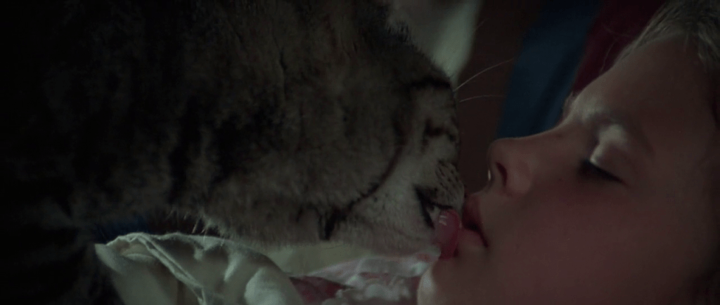 Teague ve este juego en parte desde adentro, en parte desde afuera y en parte desde adentro y afuera a la vez. Ninguna de sus películas lo muestra mejor que Los ojos del gato. El primer episodio es una extraordinaria pieza de humor negro. Su protagonista es Dick Morrison (James Woods), uno más de los innumerables yuppies de la época. Treintañero, casado, con una hija, profesionalmente exitoso, un día Dick cae en las garras de una empresa que ofrece un extravagante método para dejar de fumar: vigilancia perpetua (gran uso de “Every Breath You Take”) y, en caso de infracción, castigo a la esposa o a la hija, en el siguiente orden: descargas eléctricas (este se cumple), mutilación (este se ve en otra familia), violación y, en última instancia, asesinato (estos quedan como amenazas). Por hipérbole, la historia funciona como sátira de la vida saludable impuesta como norma por la nueva sociedad limpia de Reagan. Este tono por encima del estilo medio no solo queda lejos de Cujo sino también del último episodio de la propia Los ojos del gato: la historia de una nena amenazada por un duende que de noche entra en su pieza. La nena es Drew Barrymore, y la pieza reitera el diseño de tantas otras posteriores a ET. Es claro: después de un episodio que roza la fiereza satírica de Romero (y de un segundo sin tanta malicia pero excelente, que transcurre casi todo en una cornisa), Teague vuelve a la senda de Spielberg. O tal vez mejor: a la del Joe Dante que en los 80 trabaja con Spielberg (la escena en la que el duende es arrojado contra el ventilador por el tocadiscos que reproduce “Every Breath You Take” recuerda fácilmente a Gremlins). Lo notable es menos el movimiento de estilos dentro de la película que la soltura con la que el director maneja registros tan distintos, el brillo que consigue extraer de cada uno y ciertas contaminaciones. Porque hay por lo menos dos momentos en las películas spielberguianas de Teague que Spielberg difícilmente habría filmado. En Cujo, el mencionado plano de la adúltera poniéndose la bombacha. En este último episodio de Los ojos del gato, el gran beso de lengua que el animal le da a la nena en la cama, y que llena la película de lo que, por pudor, bien podemos llamar ambigüedad.