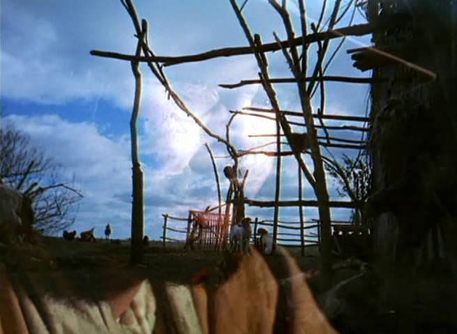 Un paneo en contrapicado desde la derecha hacia la izquierda empieza a mostrar la toldería después de los primeros versos. Confirmando el patrón espacial asignado, termina en Moreira. Como su recitado comentario dirá luego, salta a la vista la pobreza en que viven, pero Favio aprovecha la ocasión para volver a colorear el plano. Verde alfombra de pasto y sauces dorados por un sol de media tarde aparaísan el lugar, o al menos lo distinguen con el signo de la fertilidad, como uno en el que la relación de los seres humanos entre sí y de ellos con la naturaleza conserva restos de una armonía previa a toda colonización, por mucho que a estos mapuches ya se los llamara «huincas» por su adaptación -que más convendría definir como sometimiento- al poder que alteró por completo y para siempre su forma de vida. A diferencia de Gutiérrez, Favio no introduce conflicto alguno entre Moreira y los nativos. Mientras un nuevo travelling lateral sigue de cerca la caminata testimonial del gaucho, escuchamos su pensamiento en voz alta: