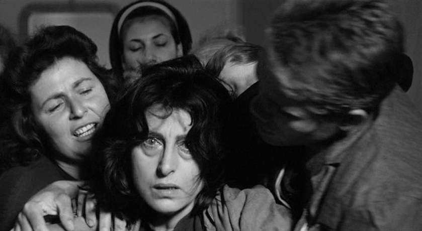 La historia de Ettore es un calvario, y con su crucifixión termina. En el final, atado a la cama de la cárcel, recibe tres travellings parecidos, desde su cara al plano general, que lo muestran en un escorzo violento. Su imagen evoca la de un Cristo histórico -pobre, italiano, analfabeto- pero su sacrificio no tiene dimensión religiosa. Es una muerte que nada redime. Una catástrofe social intrascendente excepto para su madre.