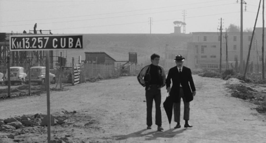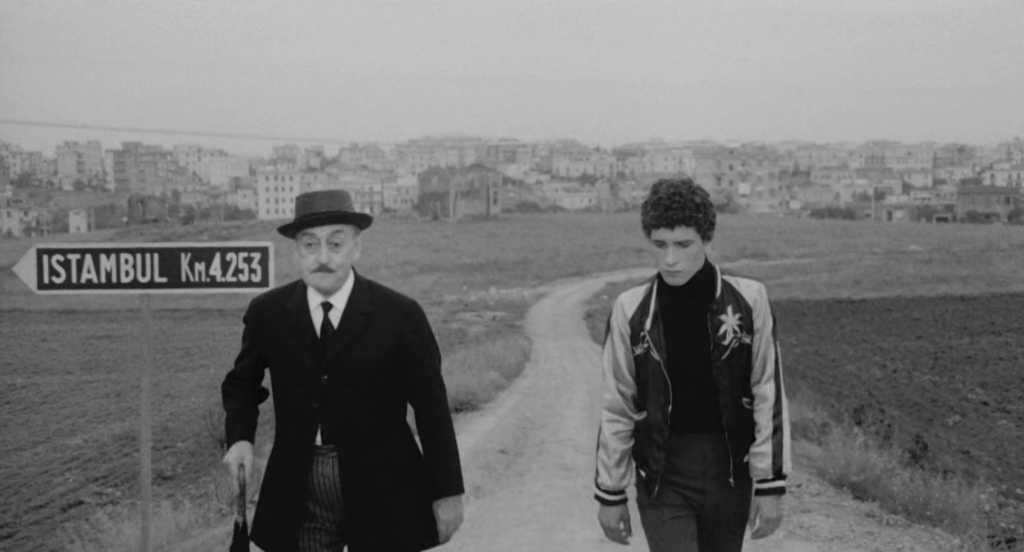 El parlamento reenvía al comienzo, al arribo del pájaro a la película, porque una de las primeras cosas que hace cuando se suma al viaje de Totó y Ninetto es preguntarles: “¿Adónde van?” Totó contesta: “Para allá”. Y el cuervo insiste: “¿Pero dónde? Eso es un poco vago”. “Para allá”, repite Toto. El cuervo, como él mismo informa, es “hijo del Sr. Duda y de la Sra. Conciencia”, viene del país llamado Ideología, en cuya capital vive, no en cualquier lado sino en la calle Karl Marx número setenta veces siete, y como aclara un cartel, por si alguien se distrajo, es “un intelectual de izquierda de antes de la muerte de Palmiro Togliatt”. Totó y Ninetto pertenecen a un mundo diferente, tragicómicamente desconectado del otro: viven en el Barrio de la Basura, calle Muertos de Hambre número 23,. Así, la diferencia entre dirección y errabundeo es la manera en la que se expresa la distancia entre la visión marxista oficial encarnada por el cuervo y la de los personajes subproletarios, lo que en Pasolini implica no un desacuerdo ideológico, que supone una base común en la que desplegarse, sino algo mucho más decisivo: un modo distinto de vincularse con lo irracional, otra temporalidad y otro uso de los cuerpos. En resumen: otra manera de existir.