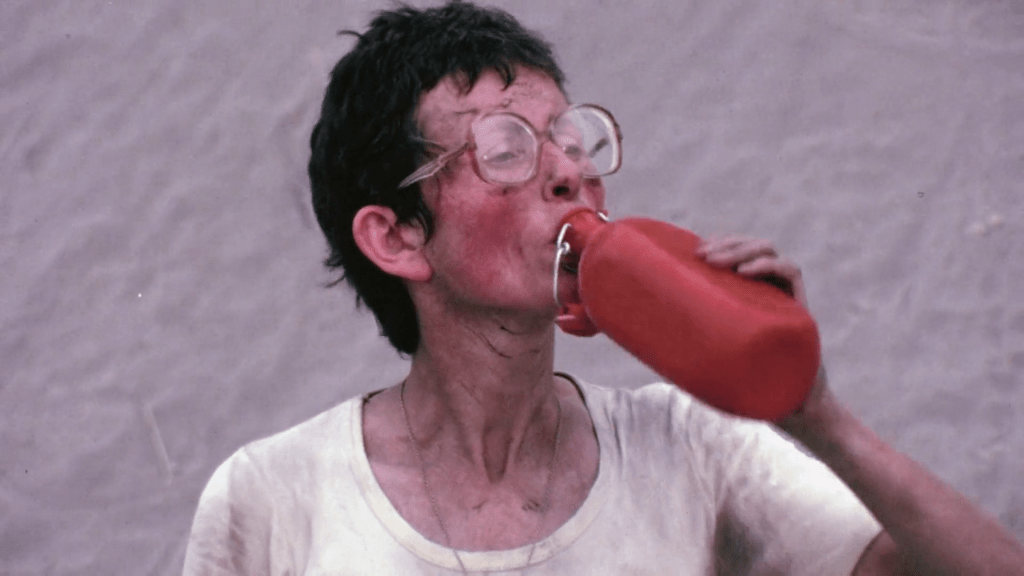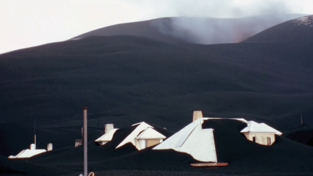 Hay un detalle en esa historia que me parece particularmente significativo y tiene que ver con la relación entre el cine y lo falso. Las primeras imágenes capturadas por el matrimonio (en rigor, son imágenes tomadas por un camarógrafo que trabajaba con ellos y los tomaba de sujetos) tienden hacia lo banal: unos burros, una chica en bikini, una salchicha italiana. También, unos experimentos científicos. El cambio se produce por un lado cuando el propio Maurice Krafft toma la cámara y, por otro, cuando ese registro empieza a dejar de lado sus pretensiones de objetividad y cientificismo y comienzan a buscar la potencia de la imagen en sí. El cambio se da de a poco pero se relaciona también con una serie de gestos que el propio Herzog se encarga de subrayar: los Krafft empiezan a montar escenas falsas para la cámara. Pasa algo, no quedó bien encuadrado, y lo repiten. Lo repiten. Lo repiten. Herzog muestra cada una de las tomas. Nace la mentira. Por otro lado, los Krafft empiezan a construirse como personajes pintorescos: Maurice empieza a vestirse a lo Cousteau, por ejemplo. En un momento, Herzog muestra un intento de probar una especie de casco salido de una película de ciencia ficción clase B, que supuestamente el matrimonio habría desarrollado para protegerse de las piedras que lanzarían los volcanes a los que se acercan. Herzog mismo remarca: “Ningún vulcanólogo serio se puso jamás un casco así” y se dedica a mostrar al matrimonio y sus supuestas pruebas para testear su nuevo invento. Una y otra vez. Como para que quede claro: los Krafft se acercan al ridículo. Por si quedaba alguna duda, incluye en el montaje una estampita de Cousteau e inmediatamente a los Krafft disfrazados, sentados sobre unos sillones inflables grotescos.