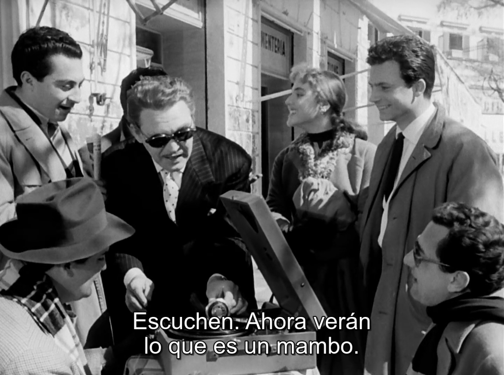 6 También Franco Fabrizi baila el mambo en Los inútiles. Pero es un mambo de moda, un mambo bailado en provincia porque en Roma es novedad. Tema para la próxima vez que escriba sobre Fellini: Fellini, el cine italiano y la música ligera. Recordar: el mambo de Silvana Mangano en Anna de Lattuada. Recordar: las canciones (Mina, Seegio Endrigo, Peppino Di Capri) de Io la conoscevo bene de Piietrangeli Recordar, aunque no se trata de una canción: el final (otra fiesta vacua) de La corruzione de Bolognini. Recordar: la secuencia de La ciudad de las mujeres con “The Visitors” de Gino Soccio y la de La voz de la luna con “You Make Me Feel” de Michael Jackson. (¿Son “música ligera” estas canciones entre el disco, el soul y el pop? Para Fellini sí, en tanto que, como el mambo, proceden de una misma fragua). Tratar de olvidar: la parodia infame de Risi en Straziami, ma di baci saziami.