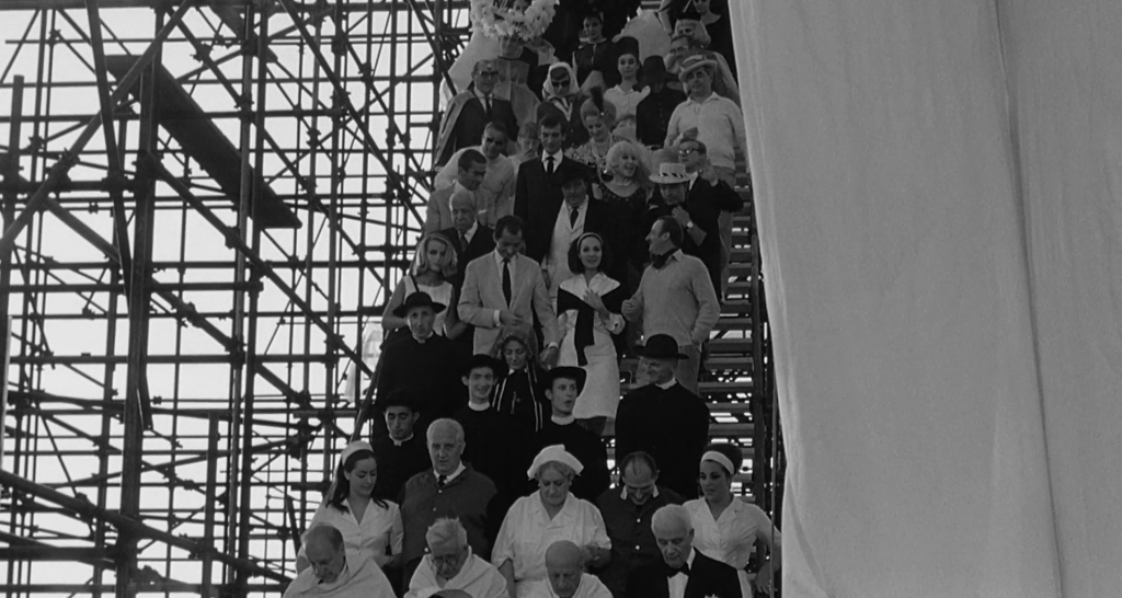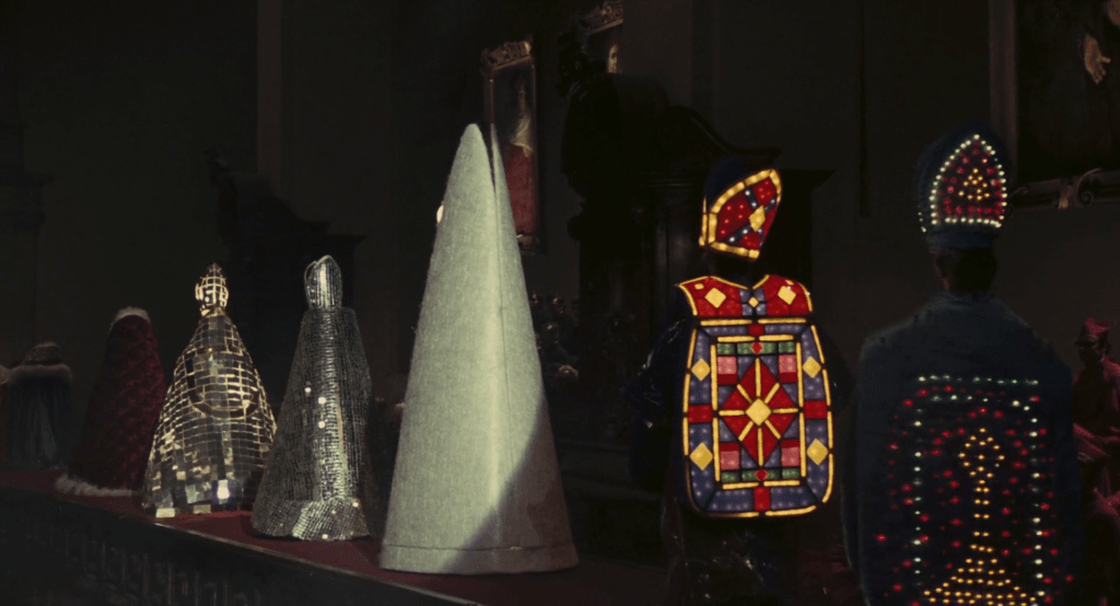 Esta tensión entre la idea -la vida en la nueva Italia es inauténtica, atronadora, incapaz de producir relaciones no regidas por el interés, el aburrimiento o la banalidad- y los obstáculos que le presentan a su expresión los mismos planos que la convocan no tiene muchos momentos mejores que el desfile de ropa religiosa que Fellini pone en escena en Roma, una pequeña obra maestra del cine decadente (otras son Casanova y Satiricón, claro). El desfile tiene lugar en una casa señorial venida a menos, ante la dueña (una tal princesa Domitilla) y sus invitados (curas, monjas, cardenales, nobles vestidos con ropas de distintas épocas), y puede pensarse en relación con la fiesta en el castillo de La dolce vita, en la que Marcello recorre una sala llena de retratos de mujeres (“un gineceo”) y un noble le dice a su hijo, en un escenario casi vacío, con apenas un candelabro y un sillón roto: “Qué tristeza ver que todo se cae a pedazos”. Roma confirma este diagnóstico pero sus ruinas tienen otro aspecto: el aspecto pútrido y seductor de lo lentamente carcomido. Las diferencias respecto de la fiesta de La dolce vita se observan en por lo menos cuatro aspectos. Primero, el sector social puesto en foco, que no es civil sino eclesiástico. Después, y en lógica solidaridad con lo anterior, la galería, cuyos cuadros de estilo tenebrista no muestran mujeres sino hombres de la iglesia. En tercer lugar, la imagen de quienes dan cuenta del paso del tiempo: el hombre que en La dolce vita se lamenta porque todo se desmorona es sobrio, distante, para nada patético; la princesa Domitilla, en cambio, es vieja, lleva un vestido y un velo negro y le dedica al pasado lágrimas y un ubi sunt. Por último, el escenario en el que se evoca el tiempo perdido: de un lado, las habitaciones despojadas de La dolce vita; del otro, el salón de Roma, primero oscuro y polvoriento y luego lleno de personas, objetos y colores (un grupo de nobles, un patio de butacas de estilo, una pasarela decadente). El desfile comienza con trajes más bien previsibles, sigue con novedades como la cofia con alerones (buena para los días calurosos), atraviesa la abstracción y un exuberante memento mori y concluye con un traje papal que produce el éxtasis de los presentes. Por supuesto, es posible hablar de sátira, con más autoridad incluso que respecto de La dolce vita, comparada más de una vez con Juvenal y Petronio. Pero si en La dolce vita Fellini mira a sus nobles con severidad y compasión (la misma compasión que les dedica a todos), en Roma los mira también estéticamente. No son solo unas almas perdidas, fuera de tiempo, o una podredumbre social y moral: son una forma.