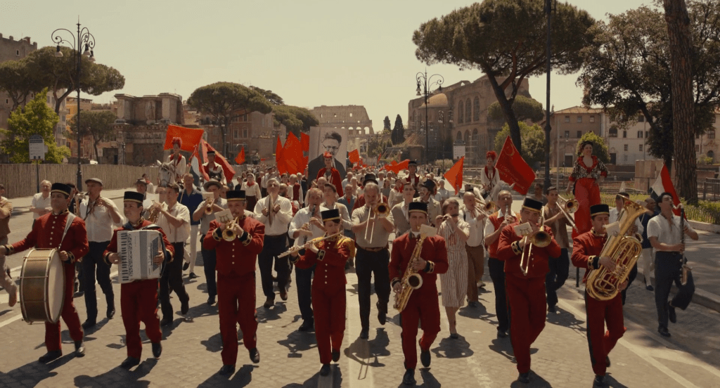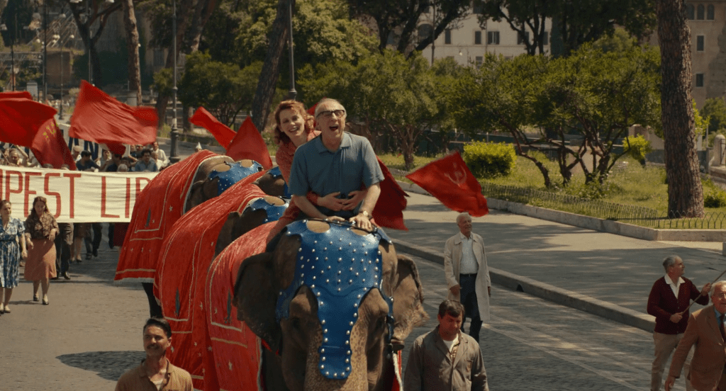 A nadie que conozca el cine de Moretti lo sorprendería la idea de lo político en el cine: desde sus constantes reflexiones partidarias y vitales hasta sus documentales políticos (La cosa y Santiago, Italia), pasando incluso por las intervenciones directas en el campo de la política italiana (el registro del final del PCI, el estreno de Il caimano durante las elecciones que terminó ganando Berlusconi), el cine de Moretti siempre dijo e hizo política. Pero, ¿qué es la política en Il sol dell’avvenire? El título suena muy comunista, los personajes en la ficción adentro de la ficción están afiliados al partido comunista y, hasta cierto punto, la historia y la vida del protagonista de esa ficción se definen por su vínculo con el partido y por su fe en él (y el final de esa fe). Pero bien al inicio de Il sol…, después de esa bella escena ficcional inicial en la que la vida de la gente del barrio de periferia de Roma se ve mejorada por la acción directa del partido en sus vidas, encontramos una escena de la ficción madre (Giovanni explicando a su equipo de producción el trabajo a hacer) en la que se juega un gag un tanto repetitivo y sin demasiado ritmo pero, sobre todo, pesado como una lápida: me refiero al intercambio entre Giovanni y un joven miembro de su equipo de producción. El director explica algo sobre los comunistas en Italia y el joven, que es millennail y por tanto (al parecer) idiota, confunde “comunista” con “ruso” y desencadena un intercambio lleno de condescendencia. Giovanni ilustra, el pibe finalmente se calla y pasamos a otra cosa. Y, sin embargo, lo que queda es un gusto amargo. No porque Giovanni menosprecie a un joven por no conocer la historia del Partido Comunista Italiano (¿a quién podría importarle eso?, sobre todo desde el escudo evidente de que, como dijimos, Giovanni es un boludo) sino porque deja en evidencia que Moretti tiene clara consciencia de que el tema que está tratando es un pedazo de historia, un tema viejo, algo que a quien vive en el presente hay que explicárselo.