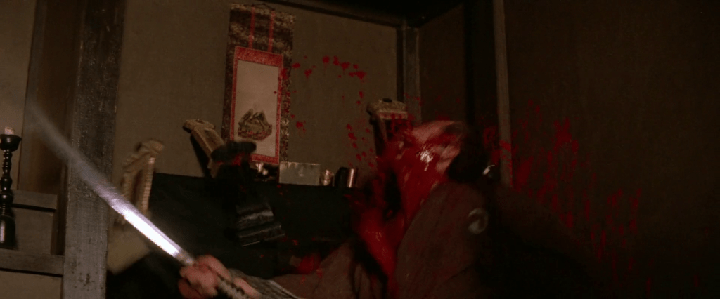 Durante cuatro minutos, entre el primer disparo y el final del tiroteo, y con una música justiciera que incluye “Unchained”, mix de James Brown y 2Pac, y “Freedom” de Richie Havens, Django pinta las paredes con la sangre que expulsan los blancos que tratan de matarlo. Pinta con sus disparos, claro, pero también con la habilidad que muestra para evitar los disparos que lo buscan, y que impactan en sus enemigos. Tarantino se toma el juego muy en serio y dedica varios planos a establecer el progreso de la pintura: primero un rociado acá, después un chorro allá, enseguida segundas, terceras, sextas manos, hasta que no quedan paredes ni puertas que no sean en buena medida de color rojo. Todo tal como habría hecho Schrader si hubiera dirigido Taxi Driver. Todo tal como hacía Misumi, que le sirve a Tarantino como término de comparación. La fama de Misumi procede en primer término de haber dado inicio y un total de seis títulos a la serie de películas de Zatoichi protagonizadas por Shintaru Katsu (veinticinco entre 1962 y 1973 y una última en 1989). Pero más cercanas a lo que Tarantino dice en Meditaciones de cine son las cuatro Lone Wolf and Cub que Misumi dirigió a comienzos de los años 70 a partir del manga de Kazuo Koike y en las que resulta especialmente notable su gusto por usar la sangre como pintura. No hay superficie que se le resista: las paredes, el agua, la arena, el suelo, el aire (¡el aire!), los árboles, el cuerpo de los que mueren o matan, la propia cámara.