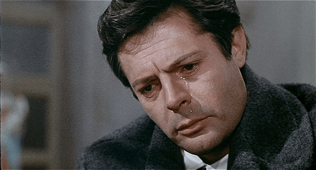 El brillo de El bello Antonio depende de muchos factores (la novela de Brancati, la dirección de Bolognini). Pero depende también, y quizás antes que nada, de la manera en la que Mastroianni sostiene esa lágrima lenta, que despide una vida que podía aspirar a no ser falsa. Lo mismo sucede en Crónica familiar, solo que el llanto (de un hombre pobre, no de un burgués) responde a la confirmación de un mundo, a su persistencia hiriente, en lugar de inaugurarlo o despedirlo. Mastroianni, a quien la vida parecía haberse aferrado sin condiciones, es el perfecto rostro de la angustia. Visconti lo intuyó en Las noches blancas. Fellini lo vio mejor que nadie. Aspirante a escritor, periodista frívolo, Mastroianni recorre La dolce vita en contradicción consigo mismo (es su gran papel moderno) y la termina en estado de vileza, entregado enteramente a la diversión maníaca, pronunciando el parlamento más feroz y desesperado de los años 60: “La fiesta no debe terminar nunca”. Tres años después, en ese otro monumento aún vital que es 8 ½, se depila el pecho para restarse virilidad e interpreta nuevamente a un personaje en crisis creativa (un director de cine, esta vez), pero en lugar de reconciliarse con la vida vacía o terminar con ella, como hace en La dolce vita su amigo Steiner, es rescatado por la ficción, única esperanza cierta concebida por el cine de Fellini.