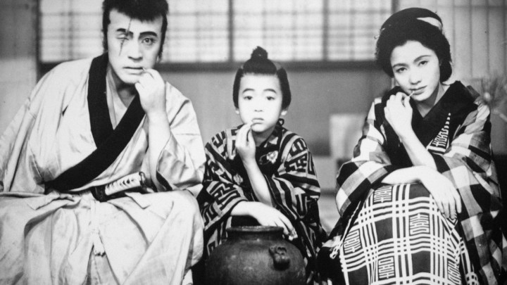 La figura central de The Million Ryo Pot es sin duda Sazen Tange, un ronin manco y tuerto que, si bien figura en el título original en japonés, en realidad está lejos de ser el centro del argumento de la película. Sazen Tange trabaja como patova en una casa de tiro al blanco en los barrios pecaminosos de la antigua Edo: una especie de antro con geishas, con la particularidad de que en él, además de chupar y charlar con jovencitas, los huéspedes se dedican a olvidar sus problemas tirando flechas a diferentes tipos de blancos. Tange se encarga de la seguridad pero, fundamentalmente, es un tipo malhumorado y malhablado, que se la pasa puteando. La presentación del personaje se da cuando la dueña del local empieza a cantar una preciosa canción melancólica, para deleite de todos los presentes, excepto para Tange, que sale de su rincón puteando porque dice que la voz de la patrona le va a causar dolor de cabeza y le grita para que no cante: al pasar por el pasillo, da vuelta una estatua que está en una mesita baja, para que quede con la cara mirando hacia la pared, y le de la espalda a la jefa. Después de esta presentación al paso, Yamanaka se dedica a filmar un momento musical suspendido en el aire: la patrona tocando el samisén y cantando sobre el paso del tiempo y el vuelo de las flechas. La canción atrae la atención del hermano segundón del gran señor feudal, que salió a recorrer la capital para ver si se encuentra con el bendito jarrón, y al pasar por la ventana del local queda prendado de la jovencita que trabaja ahí. Más adelante, va a encontrar cómo volver al local. Entre los huéspedes de la casa en ese momento se encuentra un joven viudo, padre de un chico, que trabaja todo el día peleándola, pero por las noches se viste con su mejor ropa y sale a la casa de tiro, y se hace pasar por gran empresario y olvida todos sus problemas tirando flechas. Una discusión lleva a una pelea, la pelea lleva a una tragedia y la tragedia resulta en que su hijo queda huérfano. Sazen Tange putea y gruñe, la patrona dice que ni en pedo piensa recibir al huérfano en su local ni por una noche, y por corte de plano pasamos al chico (que por los hilos de la trama imposible terminó recibiendo el jarrón de la herencia millonaria, aunque sin saber lo que es) viviendo en la casa de tiro al blanco.