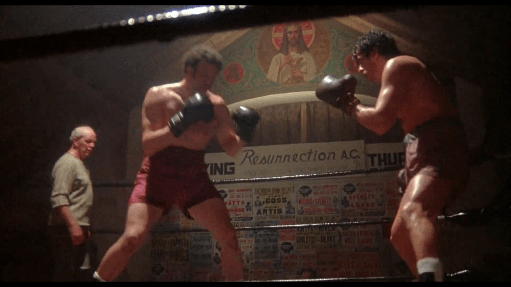 El plano que abre Rocky (1976), antes de que la saga se volviera un mito cultural, esconde un detalle fácil de pasar por alto, pero que condensa todo lo que Rocky va a vivir en los próximos cuarenta años. La pelea que abre la película transcurre en un gimnasio llamado Resurrection Athletic Club, y el plano inicial no muestra a nuestro protagonista boxeador, ni a Spider Rico su rival, ni al público, sino la figura de Cristo presidiendo el ring. Debajo de la pintura aparece ese nombre: Club Atlético Resurrección, como si el destino de Rocky ya estuviera marcado desde el arranque. Toda la saga está recorrida por esa imagen, con Jesús y la palabra “resurrección” enmarcando la historia, señalando desde el comienzo esa dinámica de caída y renacimiento. Desde ese momento, Rocky no es solo un boxeador: es la encarnación de esa lógica, un tipo al que vamos a ver tropezar, sangrar y volver a levantarse una y otra vez a lo largo de cuatro décadas.