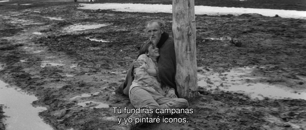 Desde esa misma idea del salto al vacío se puede entender Andrei Rublev (1966), quizá la obra más monumental de Tarkovski. La película toma al célebre pintor de íconos para reconstruir la Rusia medieval, pero no es una biografía al uso: retrata un país desgarrado por la violencia, las invasiones tártaras, la hambruna y la peste, donde la fe convive con la brutalidad. Rublev aparece como un artista en crisis, un hombre incapaz de pintar, acosado por la duda sobre el sentido de su obra en un mundo condenado al sufrimiento.