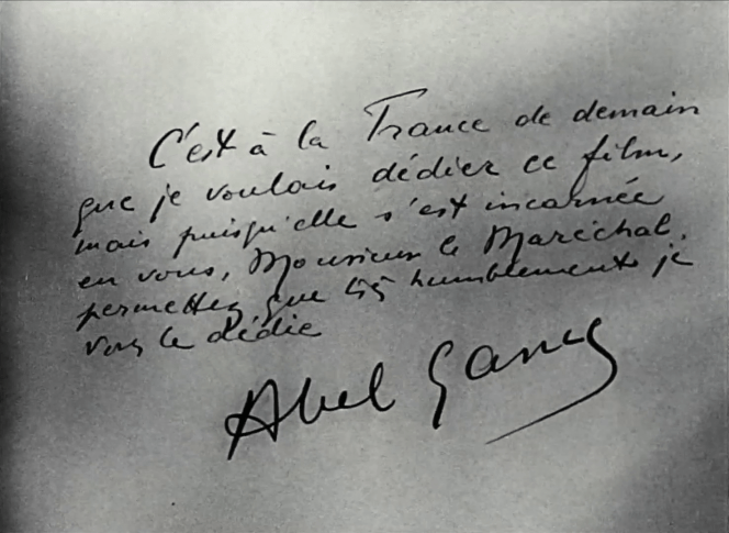 La dedicatoria dice así: “Es a la Francia del mañana que me gustaría dedicar esta película, pero puesto que está encarnada en usted, permítame humildemente dedicársela, Sr. Mariscal”. A esta inscripción puede sumarse la analogía a la que recurrió Gance cuando presentó la película en Vichy el 14 de septiembre de 1941, ante un público entre el que estaba el propio Pétain: “Para nosotros, los franceses, dos grandes nombres se levantan sobre nuestro futuro: Juana de Arco y Philippe Pétain. Juana salvó a Francia en Reims, y es desde Vichy que nuestro Mariscal salvará a Francia”. Hay quienes dicen que este apoyo, solidario en grandilocuencia con sus pensamientos y películas, era un intento por parte de Gance de resguardarse ante una posible identificación como judío. Hay quienes ponen en duda un reconocimiento a Pétain en tanto líder de la colaboración y señalan en cambio un reconocimiento al héroe de Verdún y a la leyenda del Mariscal, coherente con la idea de los Grandes Hombres a la que Gance era adepto. Y hay, finalmente, quienes no aceptan ninguna explicación de la vergüenza. Una dedicatoria, tres motivos: estrategia, filosofía de la historia, colaboracionismo.