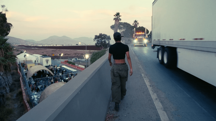 Recién entonces la película empieza a ordenarse retrospectivamente, como si el final incómodo obligara a releer las primeras imágenes. Una batalla tras otra abre con Perfidia Beverly Hills caminando de frente, en primer plano y acompañada por un piano que más que épica anuncia dominio. Después la vemos de espaldas, cuerpo entero, mientras avanza por una autopista elevada desde la que divisa un centro de detención de inmigrantes. Perfidia observa desde lo alto con soberbia y desfila entre los detenidos y los camiones. La política y la acción revolucionaria aparecen como paisaje y como excusa estetizada, lejana, subordinada a la puesta en escena del poder. La música se intensifica y seguirá funcionando como hilo melancólico que organiza la secuencia entera.