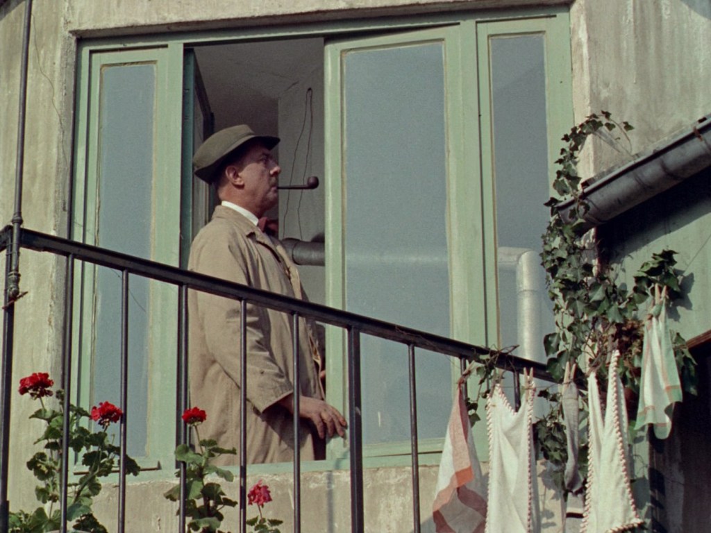 Mon Oncle, una de sus obras fundamentales, expone con claridad esta transformación. Durante su primer tramo, la película retrata dos ámbitos opuestos, construidos casi como tipos ideales. Por un lado, el universo calmo, irregular, apastelado y juguetón del barrio popular donde vive Hulot; por otro, el mundo maquinal, inerte y reglado de la casa de su hermana y de la fábrica. La tipificación se apoya en una acumulación de elementos simbólicos afines: no solo la pertenencia a estratos económicos distintos, sino también a dos lógicas de lazo social —una comunitaria y cariñosa, otra individual y racionalizada— y una serie de decisiones formales precisas. La paleta de colores, la textura de los materiales y el tamaño de los elementos chocan con encanto caricaturesco: colores terrosos y anaranjados frente a azules y verdes, maderas y ladrillo frente a plásticos y metales, la sutileza de los objetos manuales frente a la tosquedad de los aparatos automáticos.