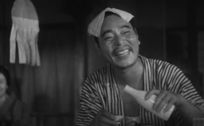 Por otra parte, donde hay una gran originalidad en Enamoramiento pasajero es en la idea de poner en el centro de la historia a Kihachi: un tipo ya maduro, padre soltero, hombre terrenal, bruto, pobre, ni siquiera buen padre o buen trabajador, mujeriego y sobre todo carente de cualquier autopercepción o vergüenza: Kihachi es pura naturalidad. Todos se burlan de él, él siempre sonríe. No conoce las reglas básicas del pudor o del comportamiento social, y se lanza detrás de una mina que es, según resulta evidente para todos los que lo rodean excepto para él, demasiado joven para ser su segunda esposa. En cualquier otra película, Kihachi habría sido, a lo sumo, el comic relief: un personaje secundario cómico, el gracioso que aparece para darle un toque ligero a la historia de otro. En este caso, de Jiro: el joven, noble y apuesto compañero de trabajo de Kihachi, que vive en la casucha pegada a la suya, trabaja con él, lo ayuda y le sirve como especie de guía moral, y es en definitiva el que sí es protagonista de la historia de amor de la película. Pero en Enamoramiento pasajero esta historia, que seguro hubiera sido el cordón central del argumento de aquella otra película hipotética más clásica, se cuenta de costado: nosotros seguimos a Kihachi, que anda calenturiento cuando se cruza con Harue en la calle y la persigue durante la primera mitad de la película, y después pasa a otras cosas. Kihachi, el mujeriego iletrado, conoce de amor pero no de idealismo: lo suyo es mucho más mundano. Para sumarle una capa a esta idea: el actor que interpreta a Kihachi es Takeshi Sakamoto, una cara que vimos un montón de veces en las películas anteriores de Ozu (casi el único actor de su elenco estable en esta película, además de la dueña del restaurante), pero siempre en papeles secundarios: era el jefe de los secuestradores en El chico franco, el presidente de la empresa en Caminá alegremente, el mayordomo viejo en La dama y la barba, el compañero de trabajo a punto de jubilarse en Coro de Tokio, uno de los ejecutivos en Nací, pero…, el conserje de la universidad en ¿Dónde están ahora…: toda una galería de hombres en general maduros, poco atractivos, varias veces cómicos. En Enamoramiento pasajero aparece rejuvenecido y lleno de vida, y sobre todo de recursos frente a cámara.