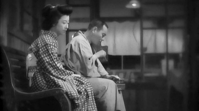 Poniéndonos en minuciosos, hay dos planos fundamentales que me interesa destacar. El primero es un plano de la examante de Kihachi, la madre de su hijo, la dueña de una posada que parecería encarnar la humildad y el sacrificio gozoso: sonríe cuando ve llegar a Kihachi pero al mismo tiempo dice que nunca podría sentirse celosa de su nueva amante. Conoce su lugar y reconoce los sacrificios. Más allá del personaje en sí, a lo que voy: cuando esta nueva visita de Kihachi al pueblo se empieza a complicar y, sobre todo, se da cuenta de que su hijo está metido en algo pero todavía no sabe bien qué, en un momento, después de hablar con Kihachi sobre él, este se va para buscarlo y la madre se queda sola en su posada. Una vez que Kihachi se va, la cámara se queda con ella, que vuelve a entrar un poco, se sienta sobre un banco y se queda con la cabeza gacha y la mirada perdida. Los segundos que le dedica Ozu a ese silencio no se deben pasar por alto: creo que es la primera vez que le dedica un tiempo así a un momento de nada, solo para acompañar a un personaje, que ni siquiera es el protagonista y tampoco está en el momento central de la historia. Ese rincón en la película de Ozu empieza a abrir una forma de narrar diferente.