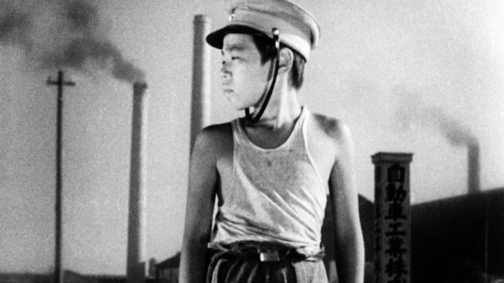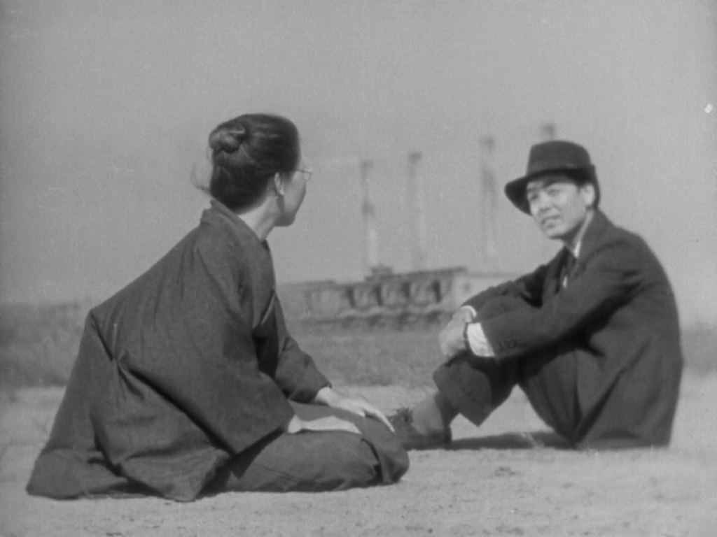 El único elemento con más forma de melo es el del sufrimiento de los padres: un tópico que atraviesa la idea de realismo para darle una dirección. Es una idea que ya se veía, por ejemplo, en Enamoramiento pasajero, pero ahí el tono era completamente diferente: la primera aparición de Kihachi también tenía algo de denuncia de la pobreza y de reflejo de las condiciones de vida duras, pero el espíritu ligero de su protagonista se imponía incluso en los momentos más duros, con la enfermedad del hijo. En Una posada en Tokio, lo que se impone es la carencia: Kihachi es el mismo (mucho más parecido al de Enamoramiento que al de Una historia), pero está tan limitado, tan gastado, tan en el extremo de morirse de hambre con sus dos hijos, que toda su exuberancia y su sonrisa quedan casi fuera de campo. Recién cuando Kihachi consigue un trabajo como obrero en una fábrica, por intermedio de una vieja amiga con la que se cruza, el tono puede suavizarse un poco y vuelven a aparecer la ligereza y el alcohol y, sobre todo, el espíritu mujeriego de Kihachi, que probablemente sea una de las cosas que más lo definen.