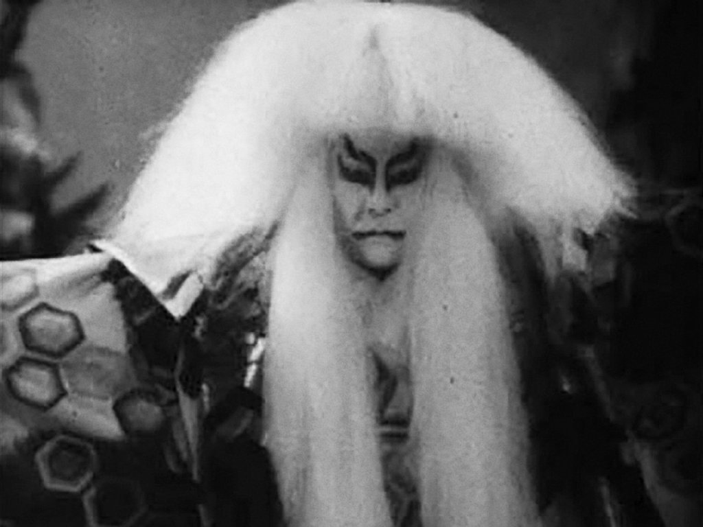 Cine puesto al servicio del kabuki y, más todavía, un arte nuevo puesto al servicio de un arte de abolengo: El baile del león tiene algo de filmación institucional, sobre todo en la secuencia inicial (unos seis minutos) que funciona como prólogo al registro del baile: es la secuencia donde hay un poco de puesta en escena, de juego de montaje, de mezcla de registro del espacio vacío del teatro, del actor en pose con vestuarios, de dibujos y detalles de vestuario, de pequeño registro “como al pasar” del actor preparándose y el público esperando, todo acompañado por una voz pareja y grave que nos explica primero que, por supuesto, todos conocen quién es el gran Kikugoro Onoe VI, pasa a hacer un pequeño recuento biográfico de este gran actor nacido en el seno de una familia tradicional del kabuki, heredero de Kikugoro Onoe V, todo salpimentado con adjetivos elogiosos y grandilocuentes. De paso, el narrador nos regala un resumen argumental del baile que vamos a ver y explica en detalle las pequeñas alteraciones que se realizaron en la escena de la obra original para preparar esta presentación que sería, entiendo, una especie de extracto de los momentos más importantes del baile. Como una selección de arias, si habláramos de ópera.